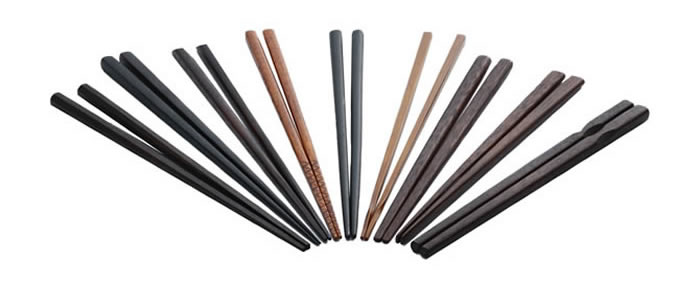お箸にも様々な塗りや形がありますが、当店では主に木箸と言われる木の素材そのものの良さを生かしたお箸を多く取り扱っています。材質は主に縞黒檀、紫檀、鉄木、山桜などです。人の手の大きさや好みもあるため、お箸の太さ、重さ、長さ、形も様々な種類のお箸があります。持ち手の形を多面形やぼこぼこした形にして手の収まりをよくしたり、手の大きい人や高齢者で握力の弱い方には少し太目のお箸の方が箸先に力が伝わりやすく感じたり、お箸の持ち方にあまり自信のない方や小さい子供さん、柔らかい食べ物や麺類を好む方には箸先の形状が四角のお箸が使い易く感じるようです。このように用途や機能性を追求した結果、実に様々な形状のお箸が作られています。